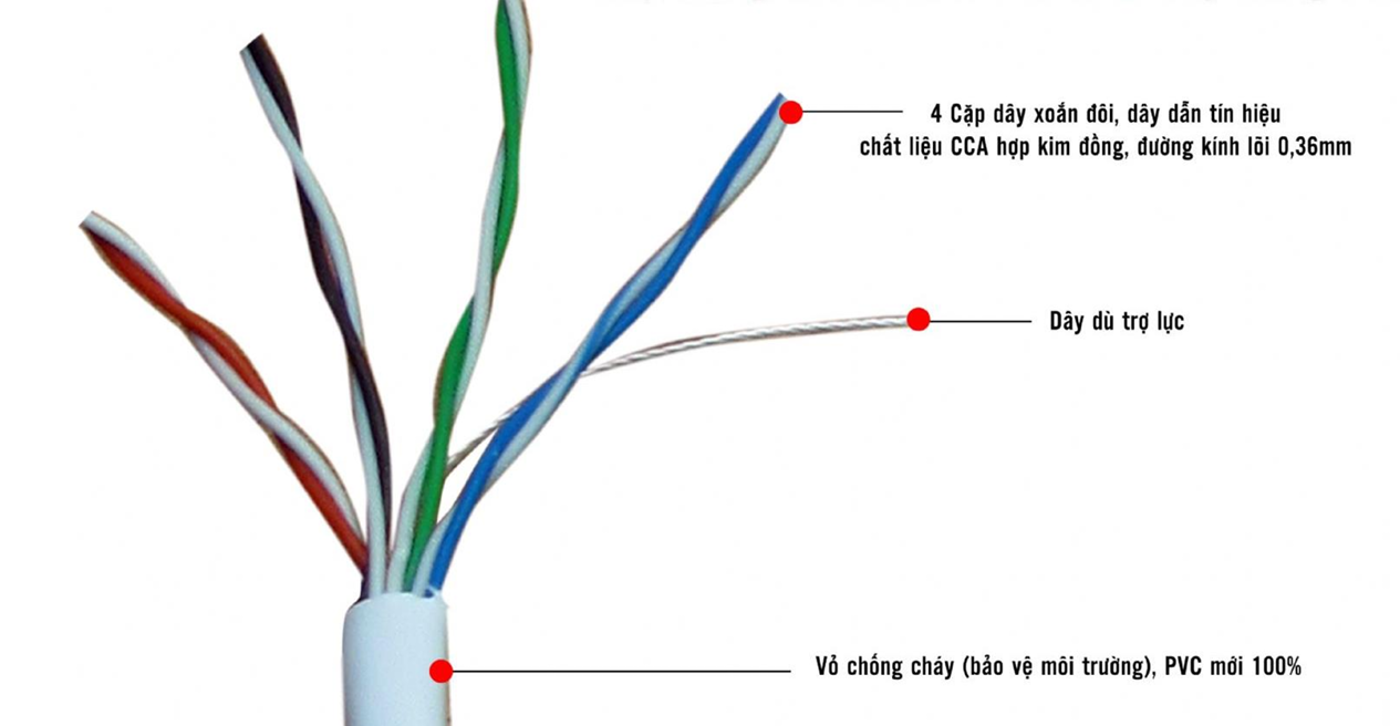 Trong một dây cáp đạt chuẩn qui định bao gồm tám sợi dây đồng, trong đó mỗi hai sợi xoắn với nhau thành từng cặp theo qui định: (nâu - trắng nâu) (cam - trắng cam) (xanh lá - trắng xanh lá) (xanh dương - trắng xanh dương) và 1 sợi dây kẽm/nilon