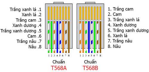 T568A (Chuẩn A) và T568B (Chuẩn B) là hai chuẩn bấm cáp quốc tế thông dụng, điểm khác biệt giữa là vị trí của các dây trong đầu bấm cáp. Hình dưới đây mô tả thứ tự màu của 2 chuẩn T568A và T568B