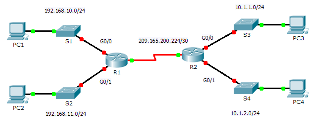 | S0/0/0 (DCE) | 209.165.200.226 | 255.255.255.252 | N/A | |