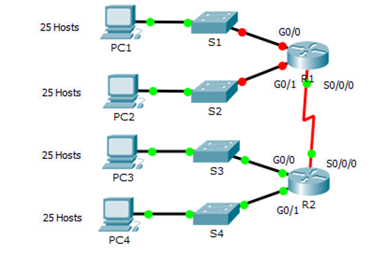 Cho mô hình mạng trên và mạng 192.168.100.0/24. Thực hiện việc chia mạng để phục vụ cho yêu cầu bài toán (chú ý số lượng mạng con và số lượng host trong các mạng con)