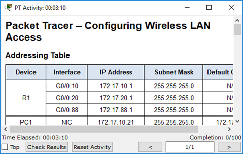 | PC1 | NIC | 192.168.10.10 | 255.255.255.0 | 192.168.10.1 |
