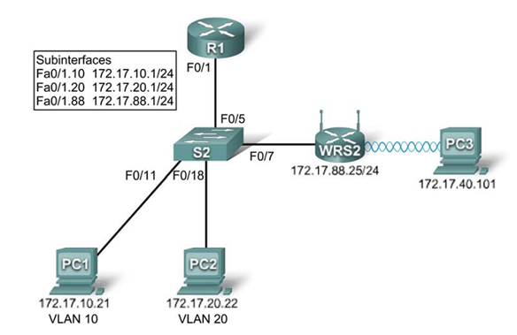 Sử dụng cáp thẳng (Copper Straight-through) để kết nối từ cổng Internet của wireless router đến cổng Fa0/7 của switch