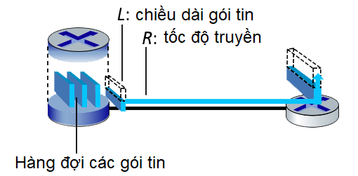 Xem hình sau đây, trong đó một bộ định tuyến đang truyền các gói, mỗi gói tin có chiều dài L và đường liên kết giữa 2 router có tốc độ truyền R. Hãy tính độ trễ truyền (theo đơn vị giây), nếu có: